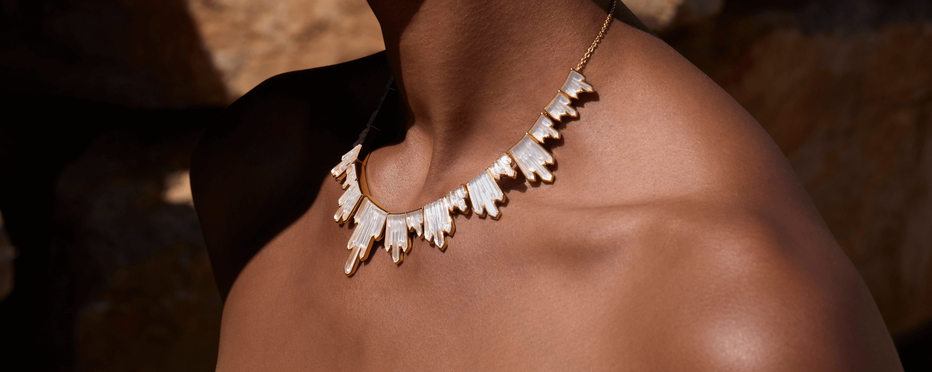 テラミネラル ジュエリーコレクションは、自然が持つ有機的な美しさからインスピレーションを得て、繊細に彫刻され研磨された3つのクリスタルカットが、さまざまなエレガントなパターンを形づくるコレクションです。
