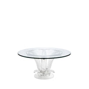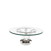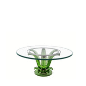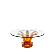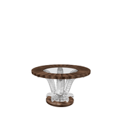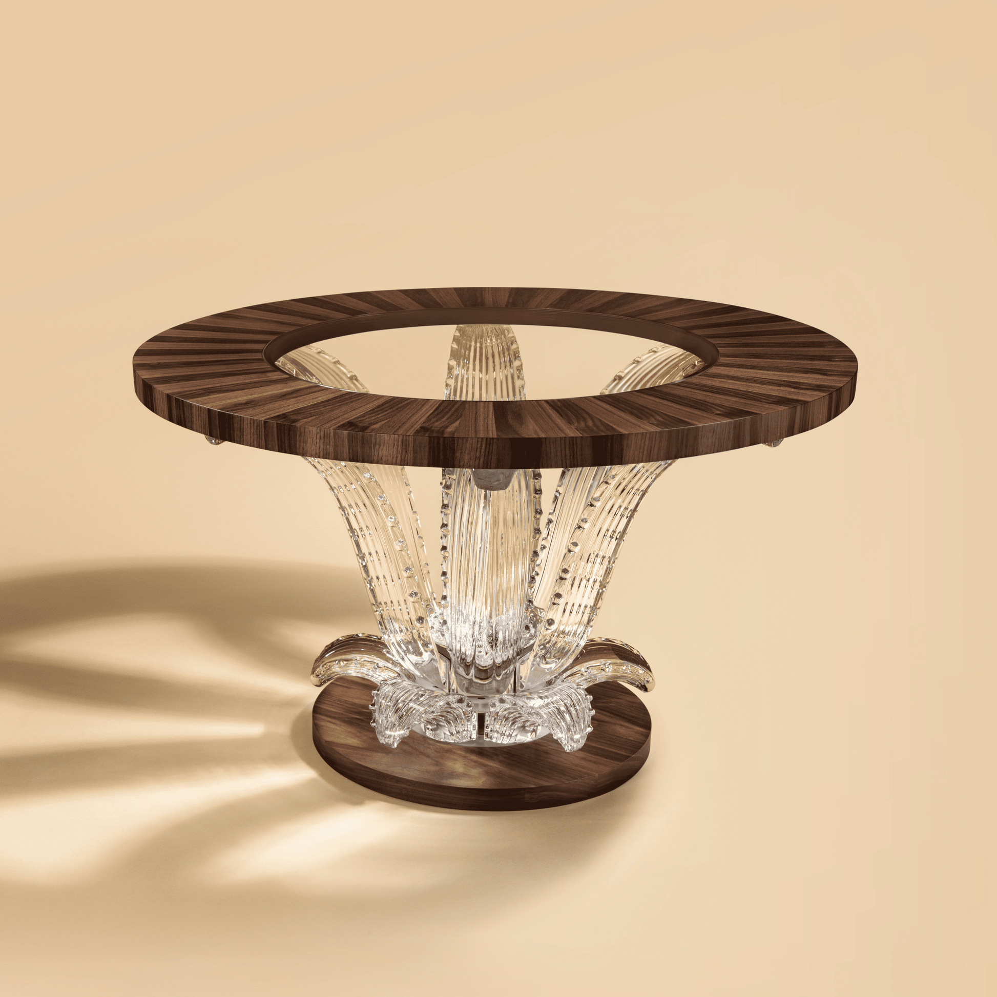 アメリカンウォールナットの寄木細工でガラスパネルを縁取った丸い天板は、透明感を通してクリスタルのディテールを際立たせます。