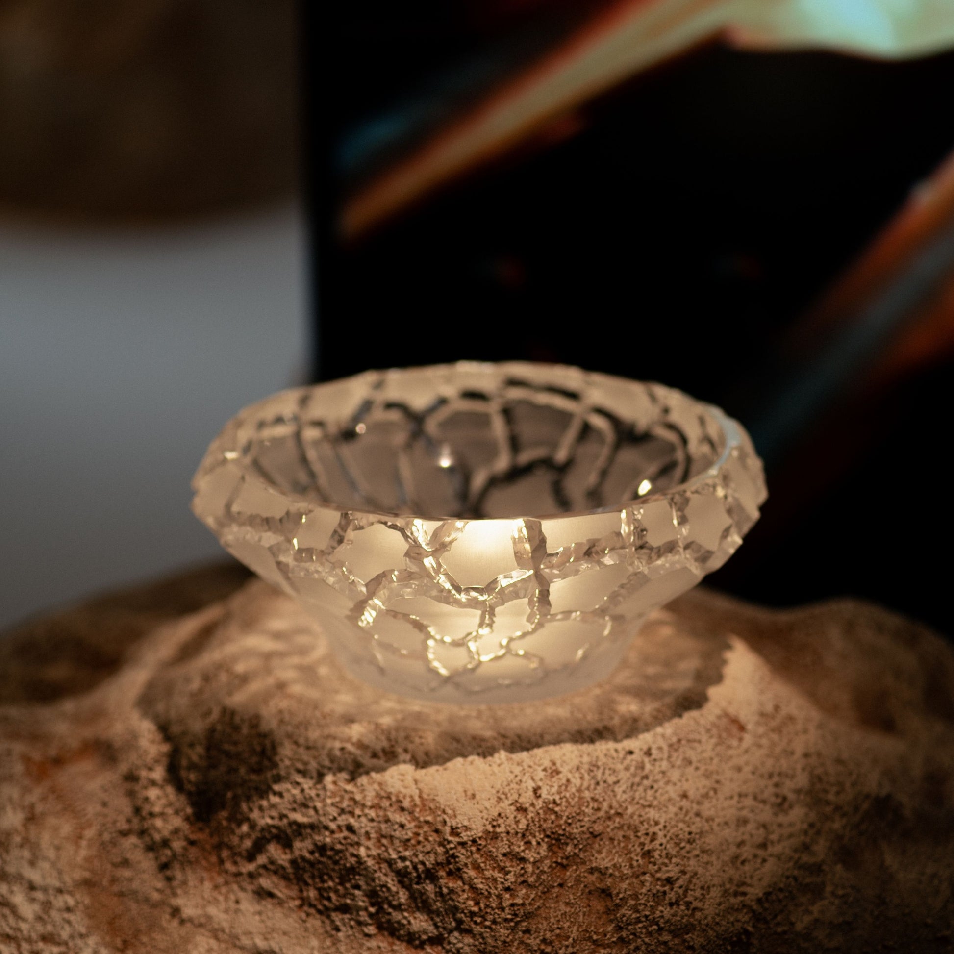 カルデラは壮大な地形の形成物であり、火山活動の証人です。その円形の形状により、この広大な火口は美の宝庫となり、千年もの秘密の守護者となっています。「カルデラ」コレクションは、その輪郭を繊細なひび割れの模様で表現し、大地の永遠の再生を想起させます。光と影のコントラストは、ラリックのシグネチャーである再研磨されたサテン仕上げのクリスタルによってさらに引き立てられ、独特な美しさとリアリズムを醸し出しています。この自然の壮大な器からインスパイアされたラリックは、その美しさをクリスタルボウルに結晶化しました。永遠に詩的な光景を私たちに与えてくれる、鉱物である地球へのオマージュです。