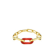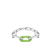 プリントのように縞模様がクリスタルの上を走り、滑らかなエッジでふと途切れるそのデザインは、触れた瞬間に繊細な質感が伝わってくるのが特徴です。金属とクリスタルが交互に連なりながら組み合わさることで、力強さと優雅さをあわせ持つ装飾品が生み出されています。