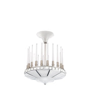 ラリックの象徴であるサテン仕上げのストライプとカボションで彫刻された光りの冠は、細長いクリスタルキャンドルで飾られ、厳格なリズムで配置されています。金属はクリスタルの純粋さと輝きを引き立てます。