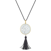 - 同色の人工シルクで繊細に編まれたタッセルとコード。ストラップの長さはドローストリングでお好みに調節できます。